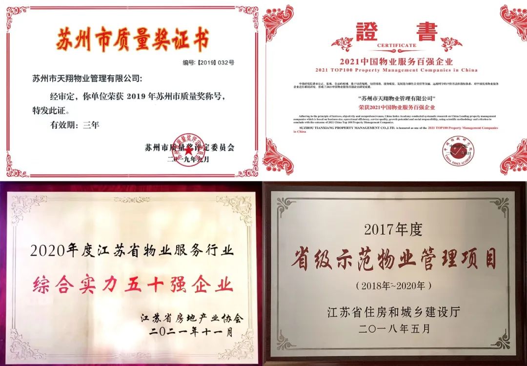 1996年,天翔物业成立于苏州吴中区。经过20年的发展,它已成为苏州物业服务行业最具实力的企业之一,不仅拥有物业管理企业一级资质,还是行业内为数不多获得由苏州市场监管局颁布“苏州市质量奖”的单位。