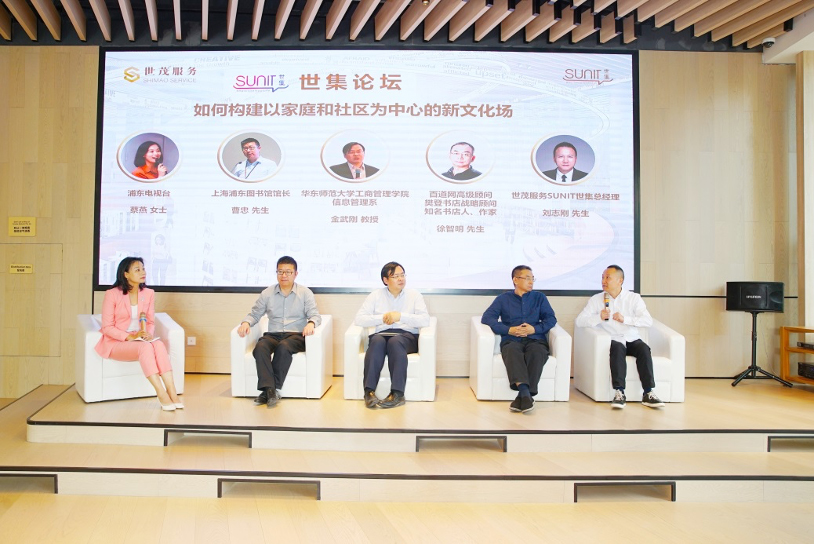 浦东新区区委宣传部文化事业处副处长张静女士、SUNIT世集总经理刘志刚先生共同为“SUNIT世集主题分馆”揭牌,为SUNIT世集图书馆的未来添上浓墨重彩的一笔。活动现场,曹忠先生、金武刚先生、徐智明先生、刘志刚先生就如何构建以家庭和社区为中心的新文化场景,开展了热烈探讨。主办方还邀请徐智明老师,为业主们开展“如何让孩子喜欢阅读”、“客厅变书房”主题演讲。