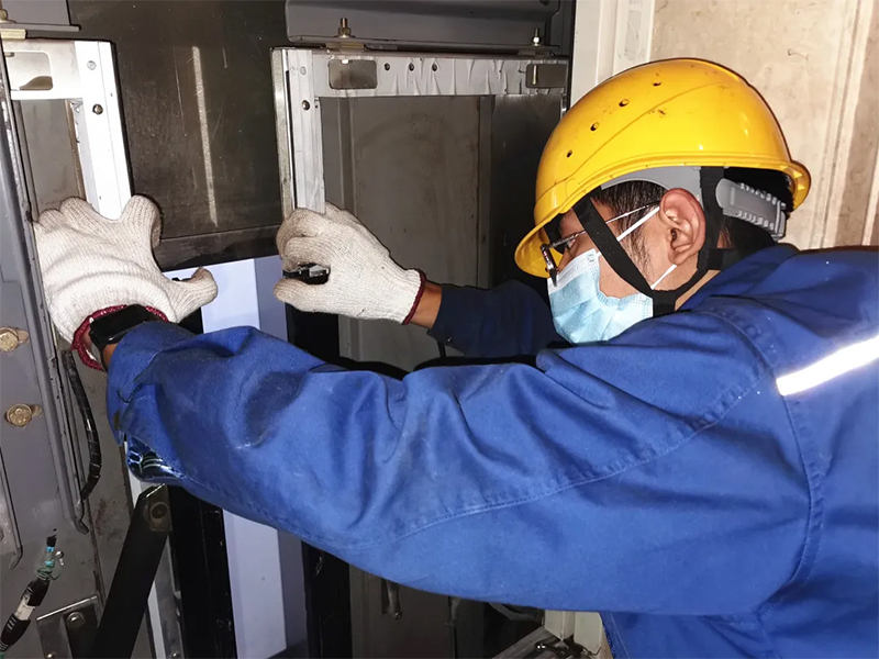 维保人员检查光幕开关部件