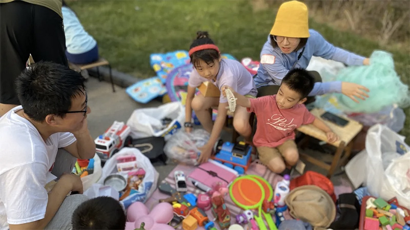 很多小业主将家里闲置的玩具、儿童书拿出来售卖,一元两元的定价不是为了从中获利,更多的是为了让二手物品流动起来,传到有需要的人手中。很多手中拿着玩具到其他摊位上以物换物,体验分享的快乐,也因此培养了节约环保的意识。